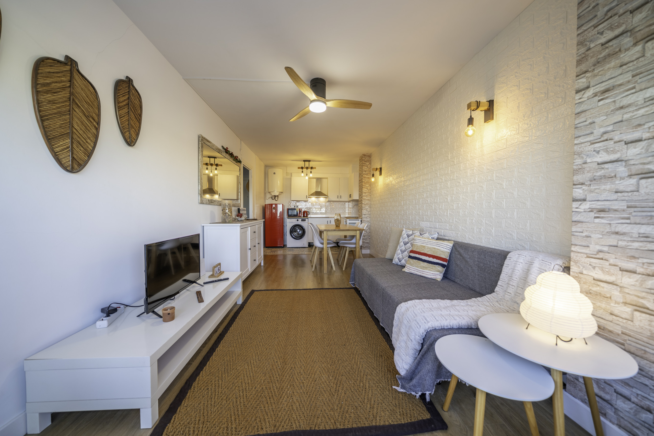 El apartamento dispone de un luminoso salón-comedor con ventilador de techo y wifi gratuito, ideal para relajarse tras un día de sol y playa. La cocina americana está totalmente equipada con todo lo necesario para una estancia práctica y confortable.